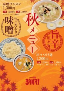 《2025年10月~2025年12月までの期間限定》 10月から秋限定メニューとして、【味噌タンメン】と【坦々つけ麺】を始めました! あなたのお好みは? ◎味噌タンメン◎ 濃厚味噌スープがクセになる、心も体も温まる一品◎ […]